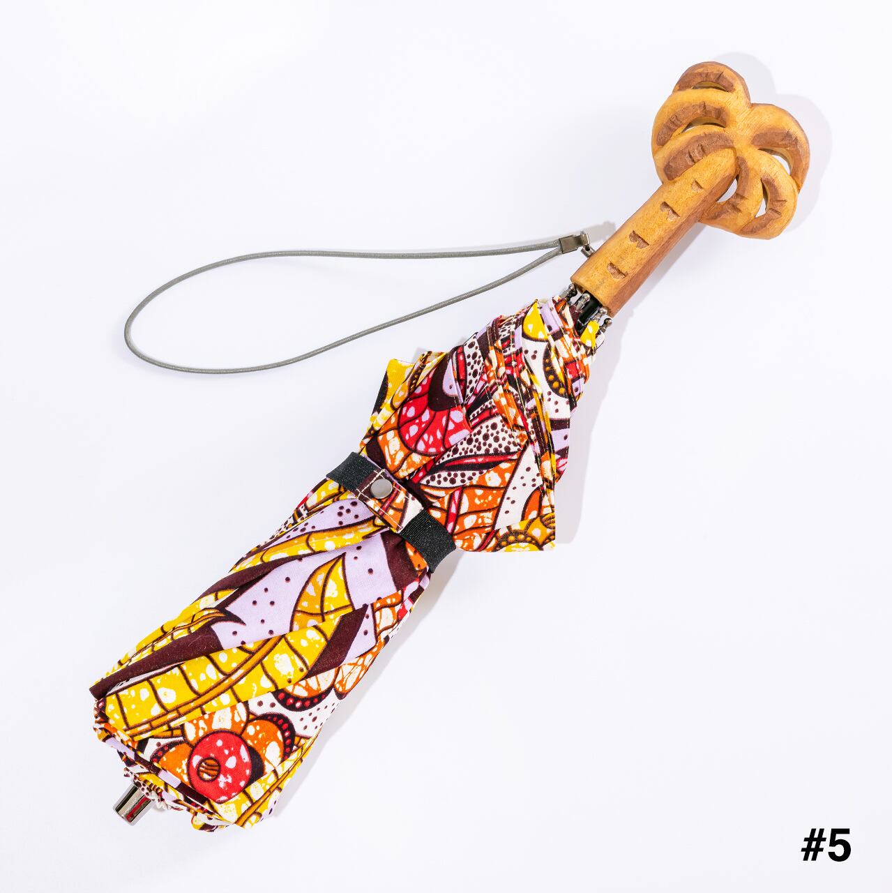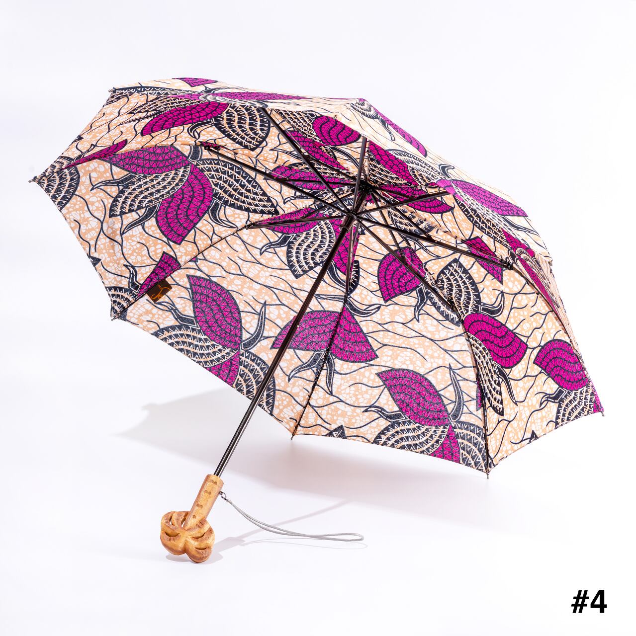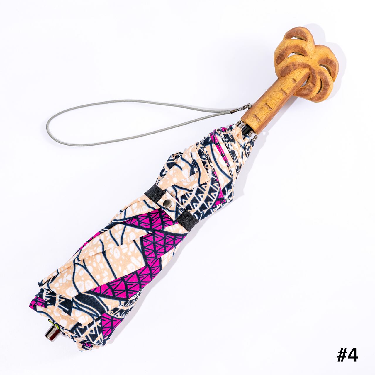 アフリカンプリントと木彫のパームツリーデザインのハンドルが特徴の日本製、晴雨兼用折り畳みパラソルです