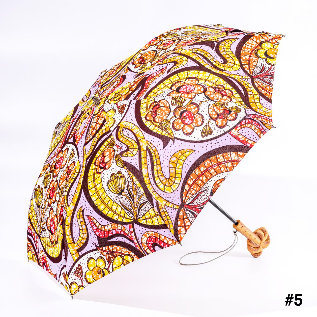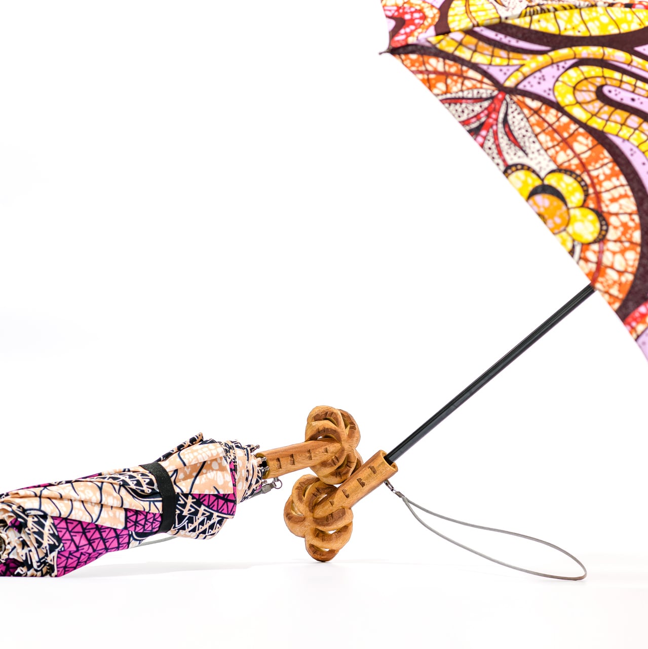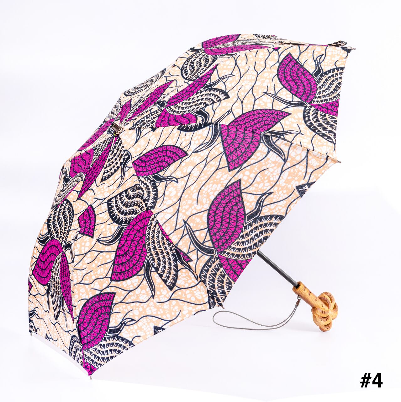 アフリカンプリントと木彫のパームツリーデザインのハンドルが特徴の日本製、晴雨兼用折り畳みパラソルです