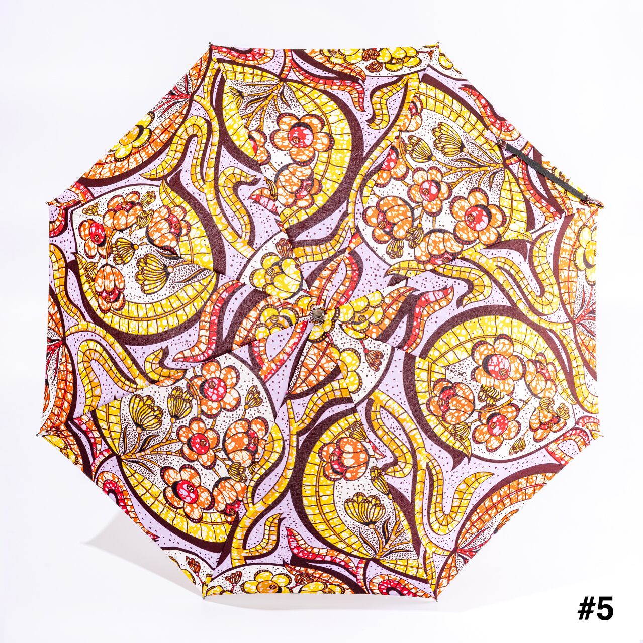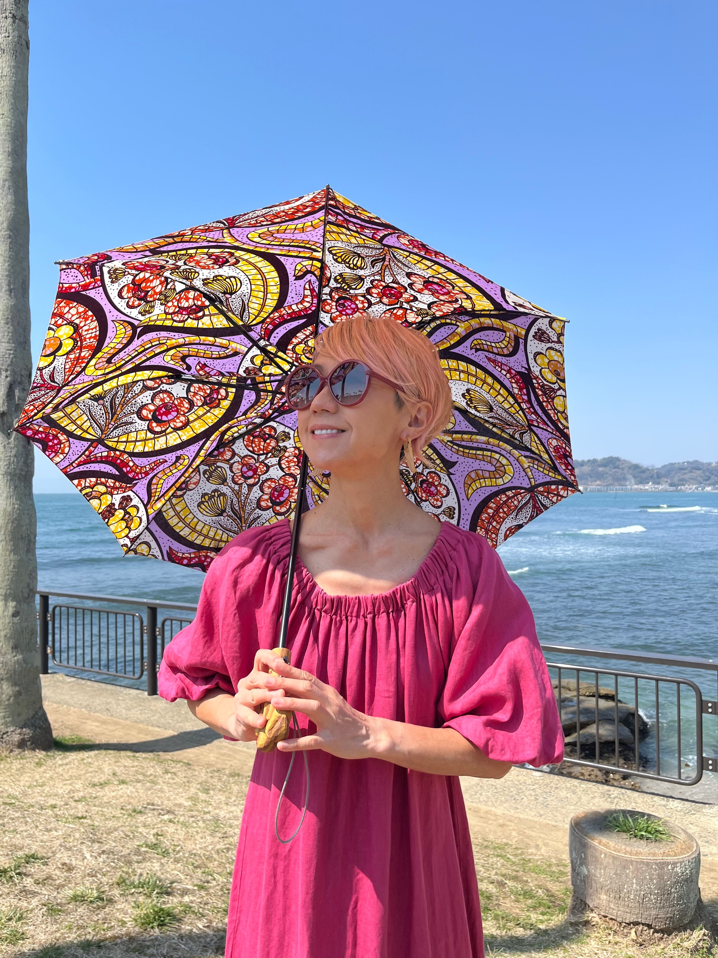 このパラソルは、アフリカンプリントの明るく大胆な柄が目を引き、さらに木彫りのパームツリーデザインのハンドルが個性的でおしゃれな一本です
