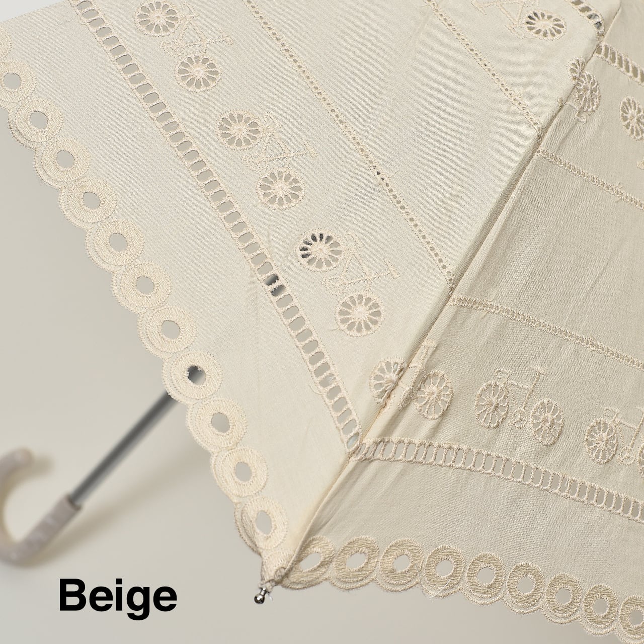 綿ローンの線細なオリジナル自転車柄レースの折り畳みパラソルです。日本の職人手作りのアクリル手元とアルミの骨を使用。小ぶりで軽いです。